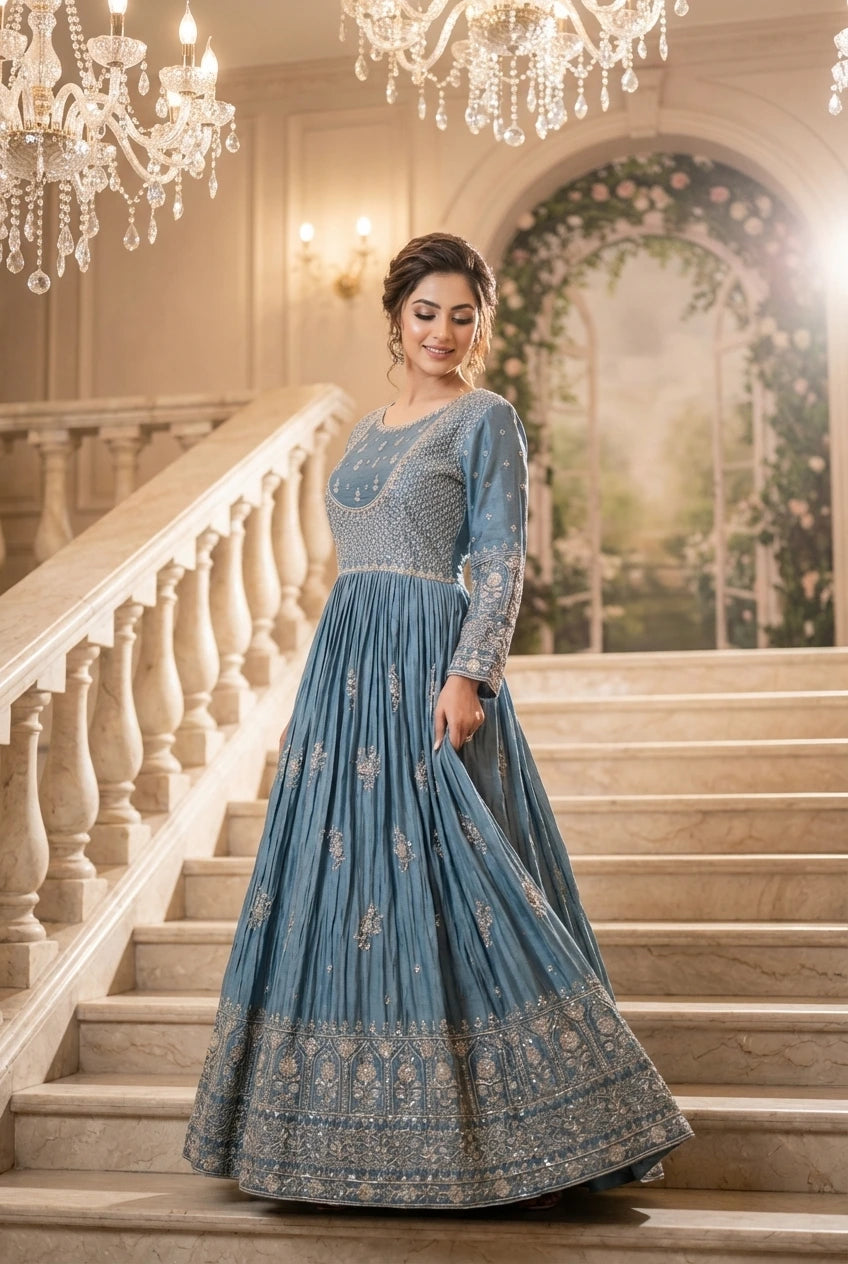 Step into a world of ethereal grace with our Dusty Blue & Silver Embroidered Raw Silk Anarkali. This exquisite ensemble is a masterpiece of traditional craftsmanship and contemporary elegance, designed to make you the center of attention at any grand occasion. The luxurious raw silk fabric drapes beautifully, creating a flowy, regal silhouette that moves with you.