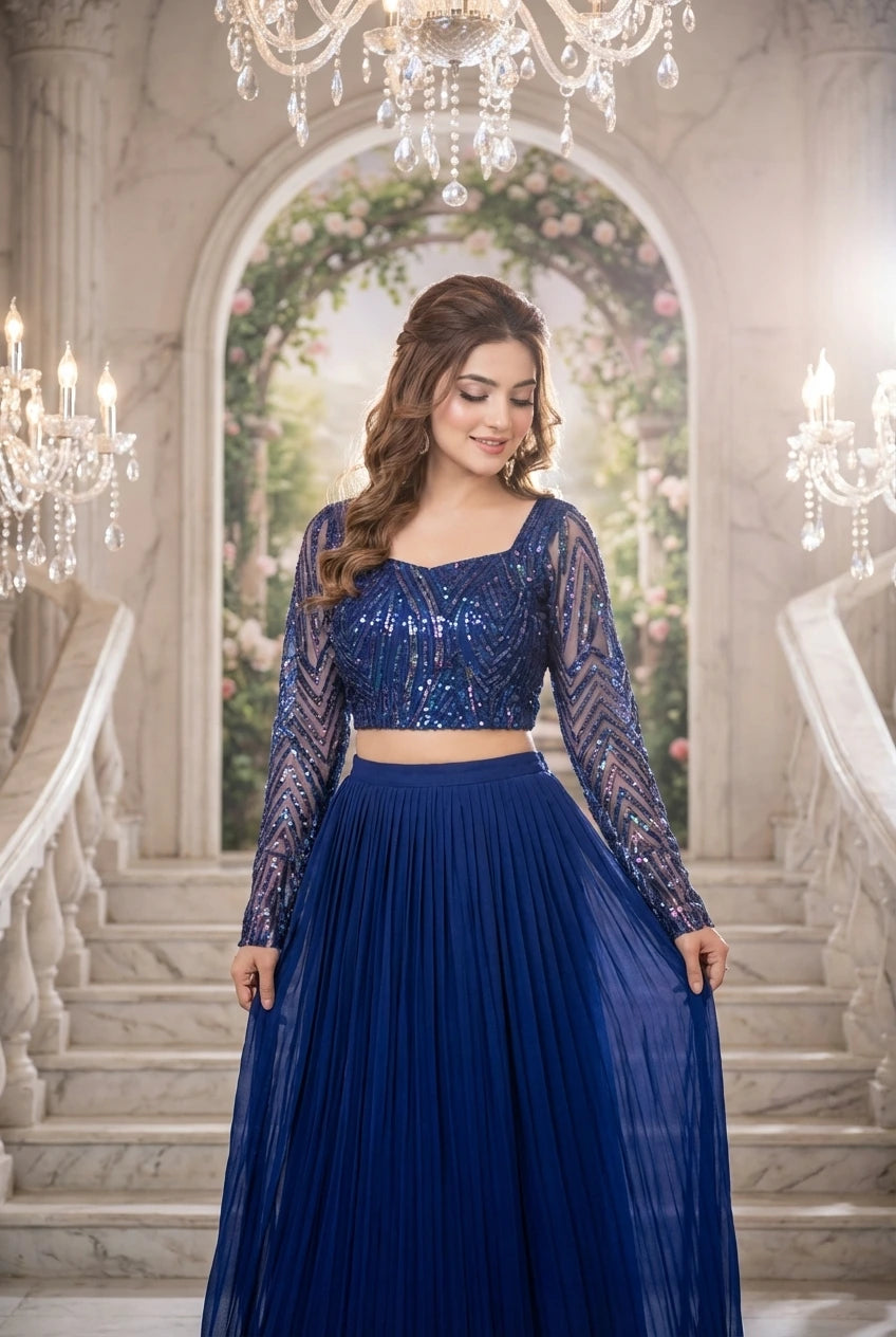 Steal the spotlight at your next grand celebration with our Celestial Shimmer Georgette Saree. Designed for the contemporary woman who loves a touch of glamour, this saree is a masterpiece of modern elegance. The deep, royal blue canvas is crafted from premium, lightweight georgette that drapes like a dream, ensuring you stay comfortable while looking effortlessly chic.