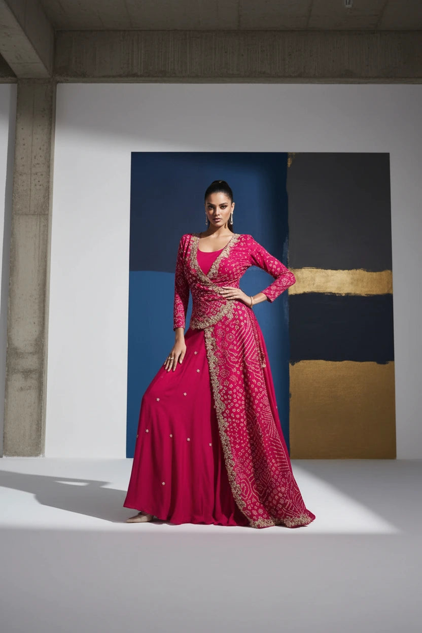 Step into celebrations with this stunning Rani pink Bhandej Indo-Fusion Gown featuring rich kardhana handwork and a flowy contemporary silhouette. Crafted in pure chinon fabric, the gown falls beautifully and offers a soft, comfortable feel, perfect for long wedding and festive functions.