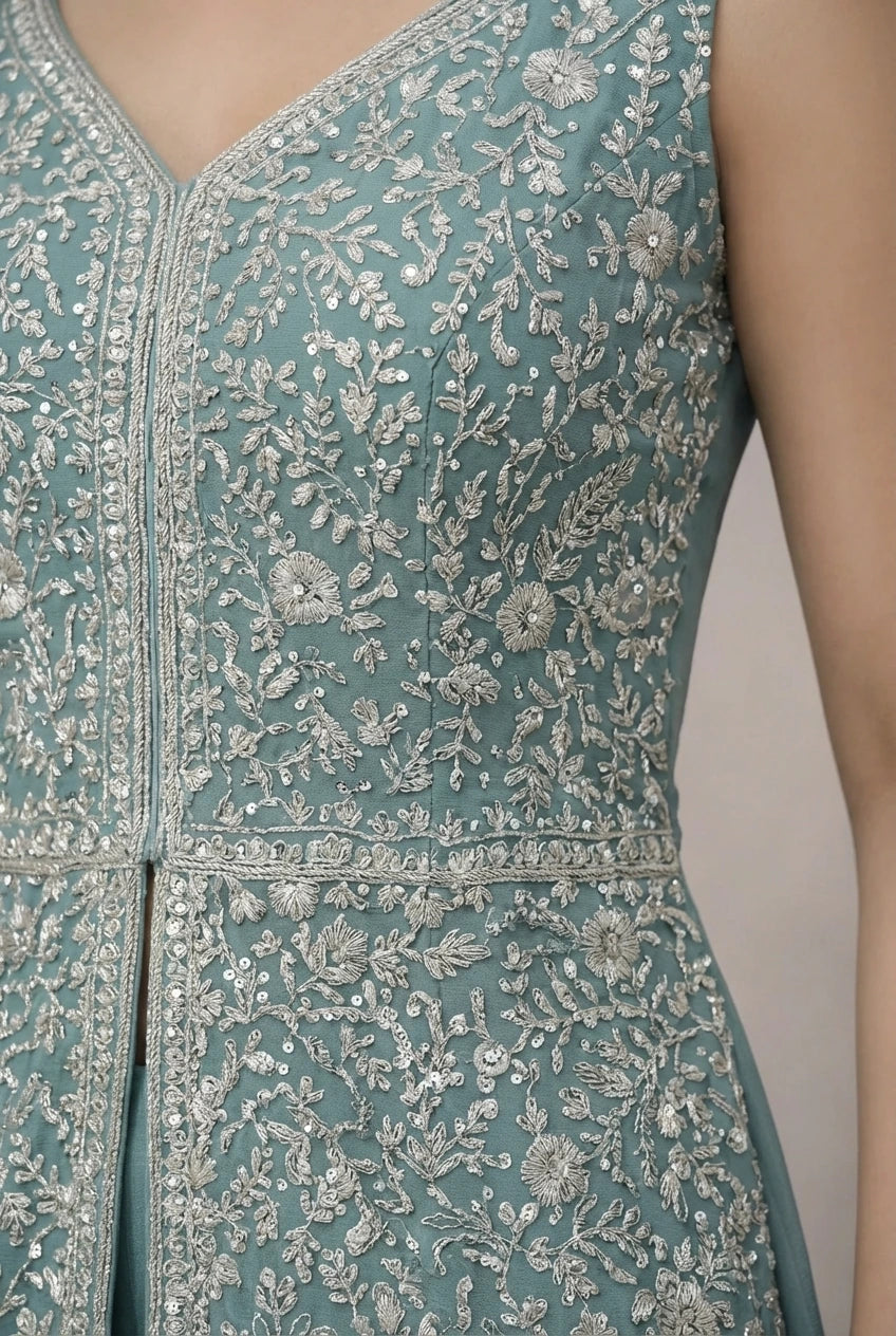 This sage green peplum sharara set features an intricately embroidered sleeveless peplum top paired with a flowy sharara and matching dupatta, creating a luxurious Indo‑western look. The bodice and waist are richly covered in floral thread and sequin work, while the structured peplum cut flatters the waist and falls gracefully over the hips.