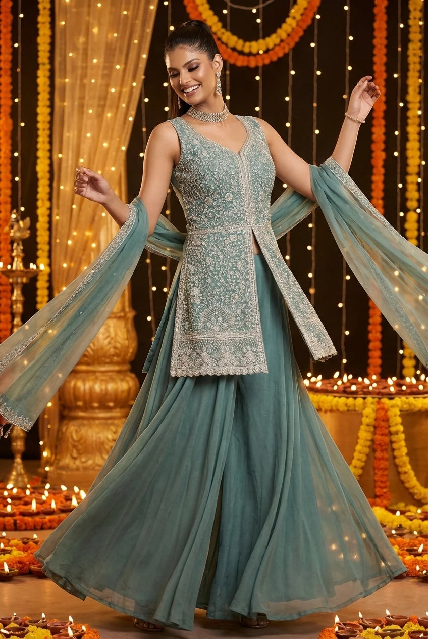 - Bottom: Flared sharara pants in soft, flowy fabric for easy movement.